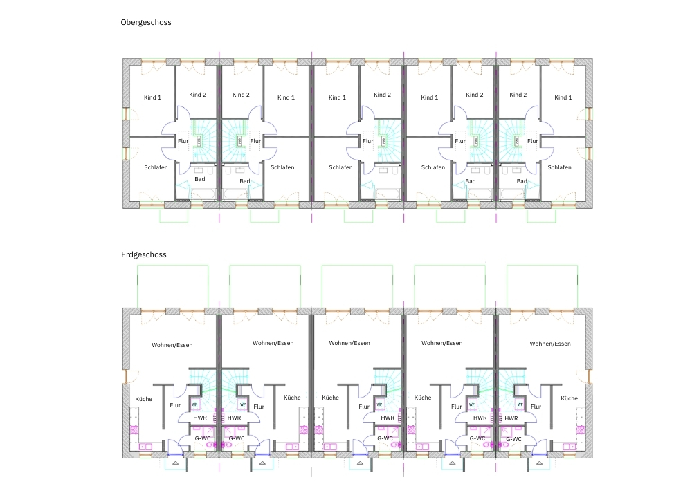 Doppelhaushälften und Reihenhäuser unterscheiden sich in Struktur und baulicher Dichte, folgen jedoch denselben planerischen Grundprinzipien: funktionale Grundrisse, moderne Haustechnik und Umsetzung im Effizienzstandard KfW 40 QNG.